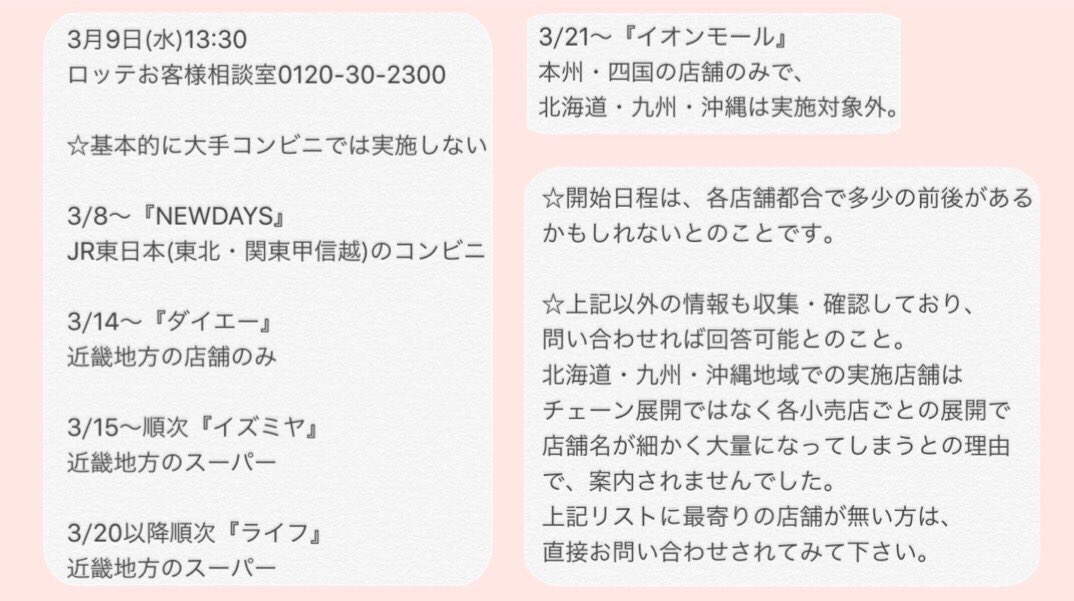あい On Twitter 0ran9eju1ce 3 9 13 30ロッテお客様相談室 から得た最新情報 3 8 Newdaysは東北 関東甲信越のみ 近畿のみ3 14 ダイエー 3 15 イズミヤ 3 20 ライフ 3 21 イオンモールは本州 四国のみ Https T Co Vqe51c8wen
