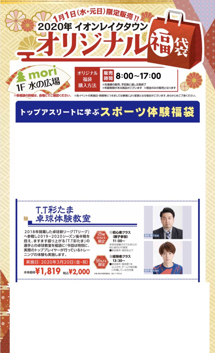 T T彩たま On Twitter 拡散希望 2020年 イオンレイクタウン オリジナル福袋の1つとして T T彩たま福袋が販売されます 内容は 坂本竜介 監督 松平健太 選手による卓球体験教室です 数量限定で販売されます ぜひお買い求めください 教室は3