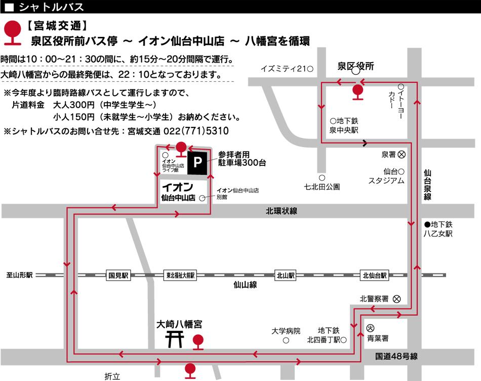 仙台都市圏交通機関情報 非公式 試験運用 Twitterren 大崎八幡宮どんと祭 宮城交通 1月14日 水 シャトルバス運行 泉中央 泉区役所前 大崎八幡宮 イオン仙台中山店を 10 00 21 30の間に約15 20分間隔で循環運行 大崎八幡宮からの最終便は22