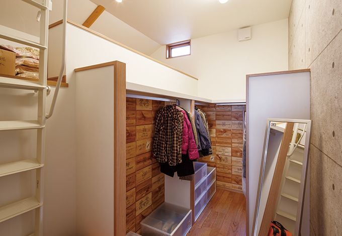 主寝室の隣に設けた4畳のウォークインクローゼット ワインの木箱や打ちっ放しのコンクリートをデザインしたユニークなクロスで遊び心も抜群 広いロ