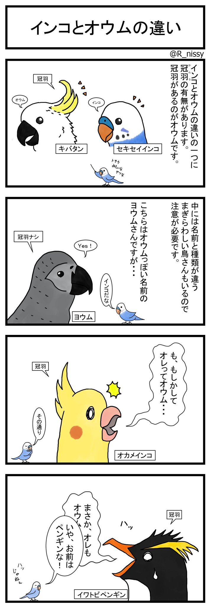 R Nissy On Twitter インコとオウムの違いを聞かれると細かな特徴はいくつかあるのだけど これ一つ覚えておけば大丈夫かなといつも思うので突然ですが4コマ漫画にしてみました 意外と簡単な分け方だよね 第2話につづく かな セキセイインコ